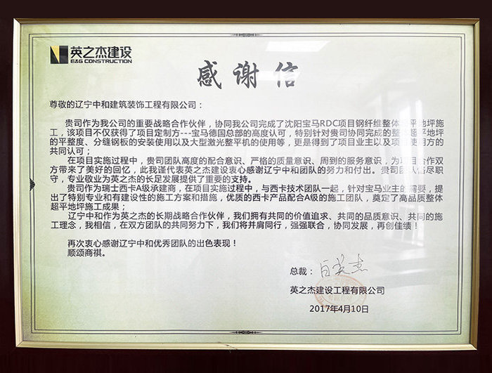 作為西卡整體地坪的核心承建商,公司所有的管理及施工團隊均接受過西卡的管理、技術及實操培訓,同時接受西卡對我公司施工質量與服務的監督。